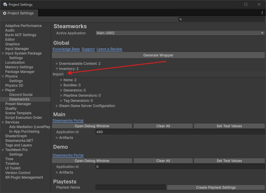 To import your Steam Inventory Item Definition into your project, you need to start your game in the Editor so that the Steam API can initialise. Then, open your Steam Settings in the inspector and click the Import option under the Inventory section.